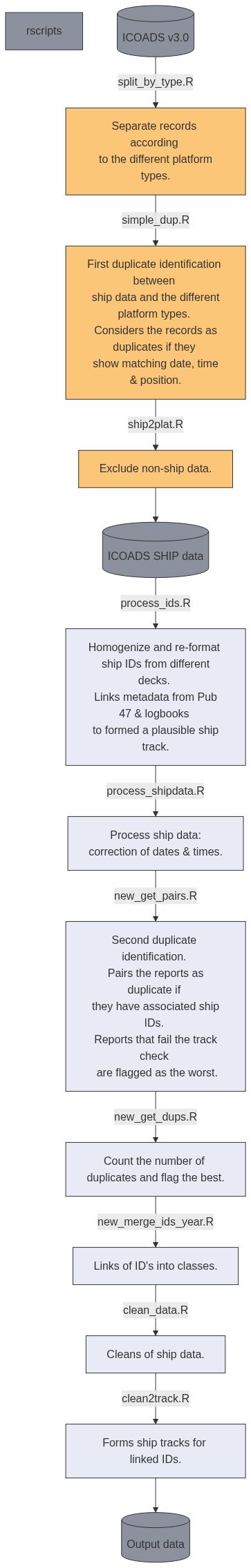 [](https://mermaid-js.github.io/mermaid-live-editor/#/edit/eyJjb2RlIjoiZ3JhcGggVEJcbkExW3JzY3JpcHRzXVxuXG4gaWQxWyhJQ09BRFMgdjMuMCldIC0tPiB8c3BsaXRfYnlfdHlwZS5SfGlkMltTZXBhcmF0ZSByZWNvcmRzIGFjY29yZGluZyA8YnI-IHRvIHRoZSBkaWZmZXJlbnQgcGxhdGZvcm0gdHlwZXMuXVxuIGlkMiAtLT4gfHNpbXBsZV9kdXAuUnxpZDNbRmlyc3QgZHVwbGljYXRlIGlkZW50aWZpY2F0aW9uIGJldHdlZW4gPGJyPiBzaGlwIGRhdGEgYW5kIHRoZSBkaWZmZXJlbnQgcGxhdGZvcm0gdHlwZXMuIDxicj4gQ29uc2lkZXJzIHRoZSByZWNvcmRzIGFzIGR1cGxpY2F0ZXMgaWYgdGhleSA8YnI-IHNob3cgbWF0Y2hpbmcgZGF0ZSwgdGltZSAmIHBvc2l0aW9uLl0gXG4gaWQzIC0tPiB8c2hpcDJwbGF0LlJ8aWQ0W0V4Y2x1ZGUgbm9uLXNoaXAgZGF0YS5dIFxuIGlkNCAtLT4gaWQ1WyhJQ09BRFMgU0hJUCBkYXRhKV1cbiBpZDUgLS0-IHxwcm9jZXNzX2lkcy5SfGlkNltIb21vZ2VuaXplIGFuZCByZS1mb3JtYXQgPGJyPiBzaGlwIElEcyBmcm9tIGRpZmZlcmVudCBkZWNrcy4gPGJyPiBMaW5rcyBtZXRhZGF0YSBmcm9tIFB1YiA0NyAmIGxvZ2Jvb2tzIDxicj4gdG8gZm9ybWVkIGEgcGxhdXNpYmxlIHNoaXAgdHJhY2suXVxuIGlkNiAtLT4gIHxwcm9jZXNzX3NoaXBkYXRhLlJ8aWQ3W1Byb2Nlc3Mgc2hpcCBkYXRhOiA8YnI-IGNvcnJlY3Rpb24gb2YgZGF0ZXMgJiB0aW1lcy5dIFxuIGlkNyAtLT4gfG5ld19nZXRfcGFpcnMuUnxpZDhbU2Vjb25kIGR1cGxpY2F0ZSBpZGVudGlmaWNhdGlvbi4gPGJyPiBQYWlycyB0aGUgcmVwb3J0cyBhcyBkdXBsaWNhdGUgaWYgPGJyPiB0aGV5IGhhdmUgYXNzb2NpYXRlZCBzaGlwIElEcy4gPGJyPiBSZXBvcnRzIHRoYXQgZmFpbCB0aGUgdHJhY2sgY2hlY2sgPGJyPiBhcmUgZmxhZ2dlZCBhcyB0aGUgd29yc3QuXSBcbiBpZDggLS0-IHxuZXdfZ2V0X2R1cHMuUnxpZDlbQ291bnQgdGhlIG51bWJlciBvZiBkdXBsaWNhdGVzIGFuZCBmbGFnIHRoZSBiZXN0Ll1cbiBpZDkgLS0-IHxuZXdfbWVyZ2VfaWRzX3llYXIuUnxpZDEwW0xpbmtzIG9mIElEJ3MgaW50byBjbGFzc2VzLl1cbiBpZDEwIC0tPiB8Y2xlYW5fZGF0YS5SfGlkMTFbQ2xlYW5zIG9mIHNoaXAgZGF0YS5dIFxuIGlkMTEgLS0-IHxjbGVhbjJ0cmFjay5SfGlkMTJbRm9ybXMgc2hpcCB0cmFja3MgZm9yIGxpbmtlZCBJRHMuXSBcbiBpZDEyIC0tPiBpZDEzWyhPdXRwdXQgZGF0YSldXG5cbmNsYXNzRGVmIHByZS1wcm9jZXNzaW5nIGZpbGw6I2ZjYzY3OSxzdHJva2U6IzMzMyxzdHJva2Utd2lkdGg6MXB4XG5jbGFzc0RlZiBzY3JpcHRzIGZpbGw6IzhDOTI5RCxzdHJva2U6IzMzMyxzdHJva2Utd2lkdGg6MXB4XG5jbGFzc0RlZiByZXN0IGZpbGw6I2U4ZWFmNixzdHJva2U6IzMzMyxzdHJva2Utd2lkdGg6MXB4XG5jbGFzcyBpZDIsaWQzLGlkNCBwcmUtcHJvY2Vzc2luZztcbmNsYXNzIEExLGlkMSxpZDUsaWQxMyBzY3JpcHRzO1xuY2xhc3MgaWQ2LGlkNyxpZDgsaWQ5LGlkMTAsaWQxMSxpZDEyIHJlc3QiLCJtZXJtYWlkIjp7InRoZW1lIjoiZGVmYXVsdCJ9LCJ1cGRhdGVFZGl0b3IiOmZhbHNlfQ) |